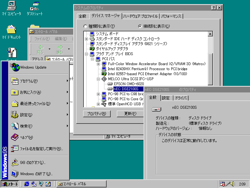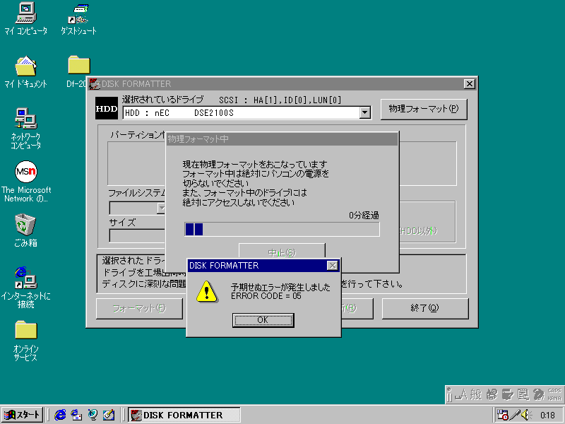 Windows98SEのマイコンピュータは表示しませんがデバイスマネージャーでは「nEC DSE2100 S 」と認識しプロパティは「正常」の表示ですがドライブレター表示枠はグレーで無表示です。バッファローのフォーマッタでは「nEC DSE2100 S 」とディスク認識しますがフォーマットできません。「DOS/V用と考えられる…」,「このドライブは9800用に初期化されていません。初期化しますか。」などの表示でますが結局フォーマットまで行きません。物理フォーマットはスタートまで行きますがしばらくすると「予期せぬエラー」「ERROR CODE=05」で止まります。