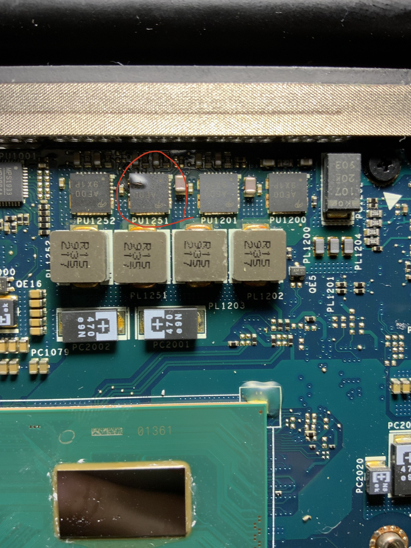 DELL XPS 7590でNetflixを見ていたら突然煙を出して電源が落ちました。数週間前に内部を掃除してグリスを塗り替えたばかりでした。内部を確認したところ、PU1251(おそらくpwm制御のトランジスタ?)という部品が破裂して焦げているのが確認できました。(画像を添付しました)