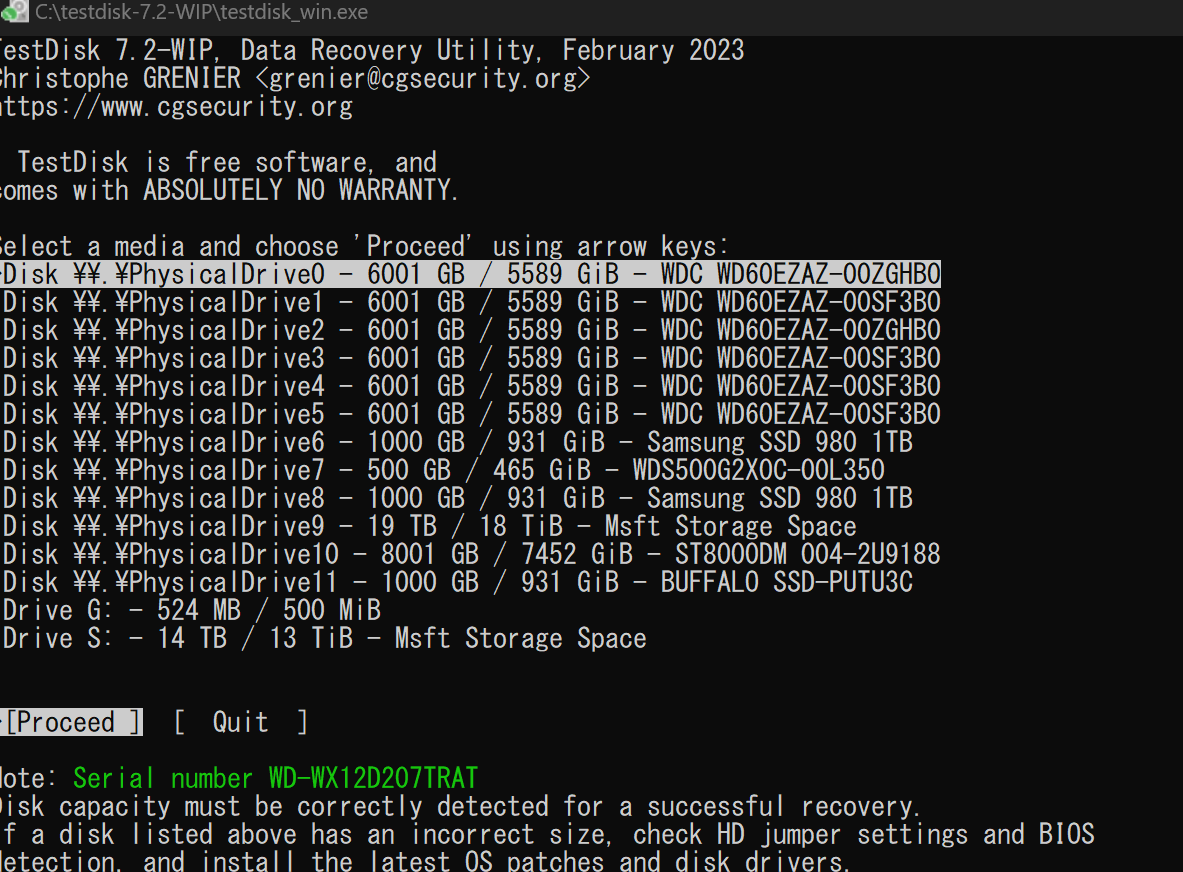 なお、復旧するときですが、画像の下から2番目のドライブSでは異常に読み込みに時間が掛かり上手くいきませんでしたが、